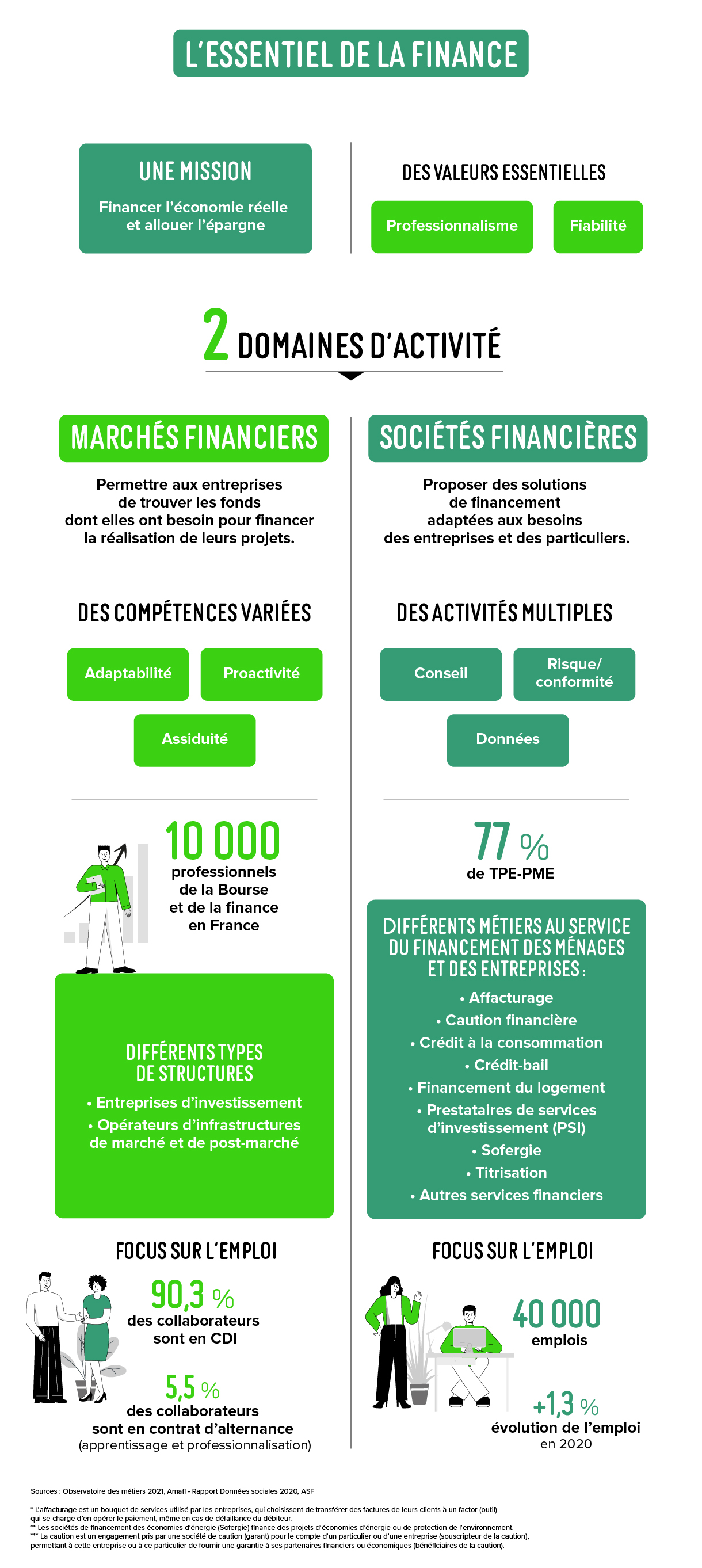 Il se scinde en deux secteurs majeurs : les marchés financiers et les sociétés financières. Souvent méconnus, les métiers de la finance recherchent des profils de spécialistes (droit fiscal et commercial, comptabilité, connaissance de l’organisation d’une entreprise, etc.), prêts à anticiper l’évolution et le changement de l’activité économique.